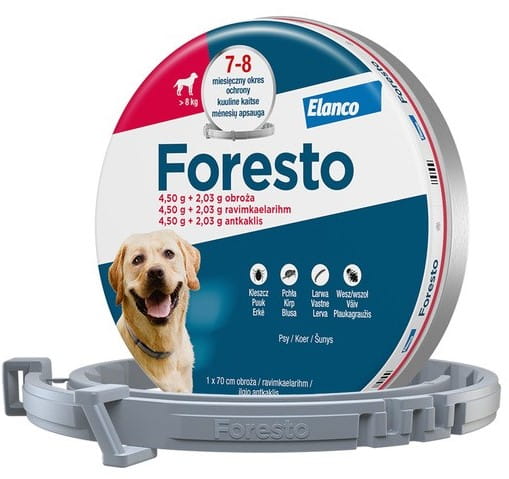 ELANCO Foresto to obroża zabijająca kleszcze, pchły, wszoły oraz działająca odstraszająco na kleszcze (zapobiega ich żerowaniu).
