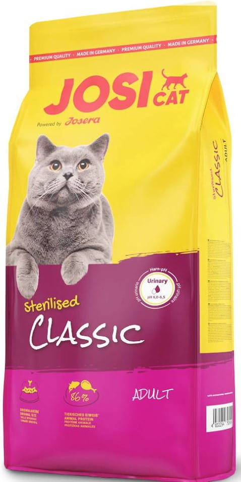 Przebój wśród kotów! JosiCat Sterilised Classic to pełnowartościowa karma z odpowiednimi składnikami wyselekcjonowanymi tak, aby spełniały zmienione po kastracji zapotrzebowanie kotów na składniki odżywcze. Wysokiej jakości składniki tworzą zbilansowaną dietę, która zapewnia Twojemu kotu wszystko, czego potrzebuje, dzień po dniu. Niższa zawartość tłuszczu i wyższa zawartość białka stymulują metabolizm, pomagając w utrzymaniu zdrowej wagi. Idealnie zbilansowane proporcje składników mineralnych pomagają utrzymać wartość pH moczu na poziomie 6,0–6,5, przeciwdziałając tworzeniu się kamieni żółciowych. Zawiera 86% białka zwierzęcego, nie zawiera soi, cukru ani nabiału.