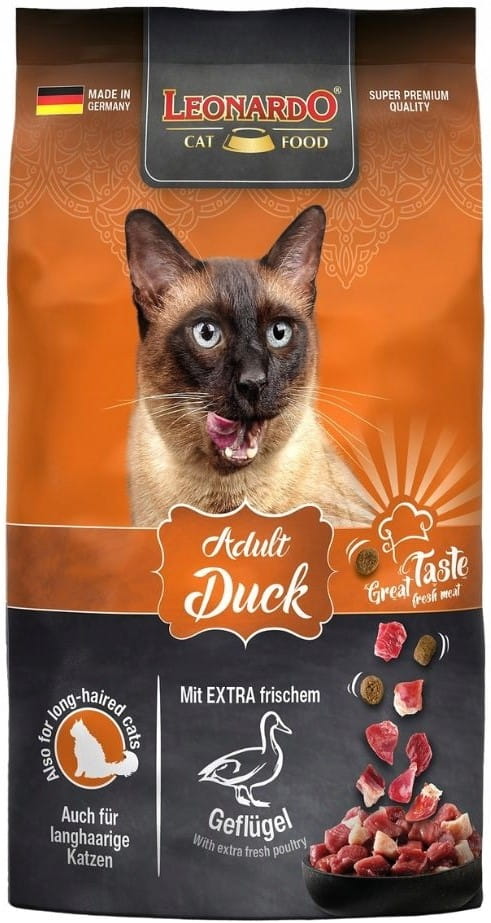 LEONARDO Adult Duck to smaczny smak dla kotów kochających drób. Przepis został również ulepszony poprzez dodanie nasion chia i pysznego kryla - skorupiaków z Antarktydy. Wysoki poziom kwasów tłuszczowych Omega-3 wraz z lecytyną pomaga zachować zdrową skórę i lśniące powłoki.