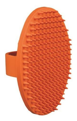 Owalna szczotka do masażu wykonana z gumy, zakładana na dłoń. Polecana dla ras krótkowłosych.