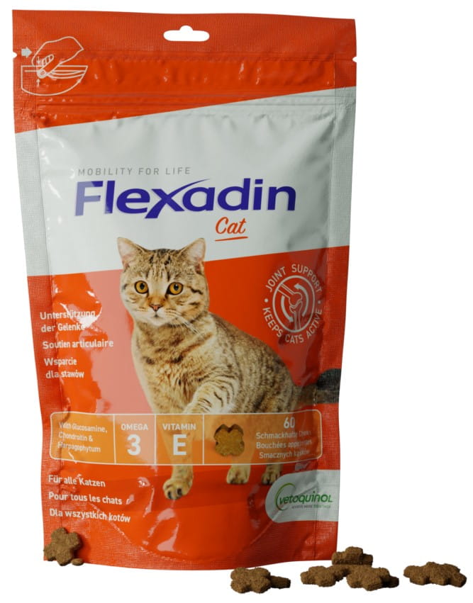 VETOQUINOL Flexadin to przekąska funkcjonalna dla kotów. Regularne stosowanie produktu zwiększa gibkość i elastyczność stawów, tym samym pomagając zwierzęciu zachować mobilność. To idealna propozycja dla kotów starszych lub cierpiących na choroby związane ze stawami. Doskonały smak suplementu sprawia, że z chęcią zjadają go wszystkie mruczki.